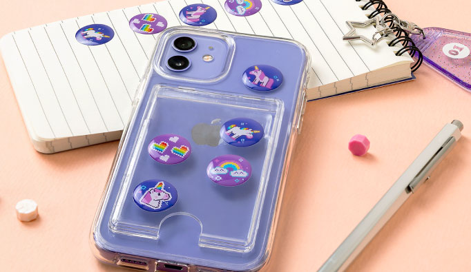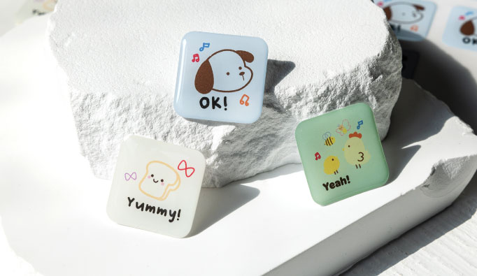 透明なエポキシ樹脂を表面にコーティングすることで、ぷっくりとした厚みとツヤ感が生まれ