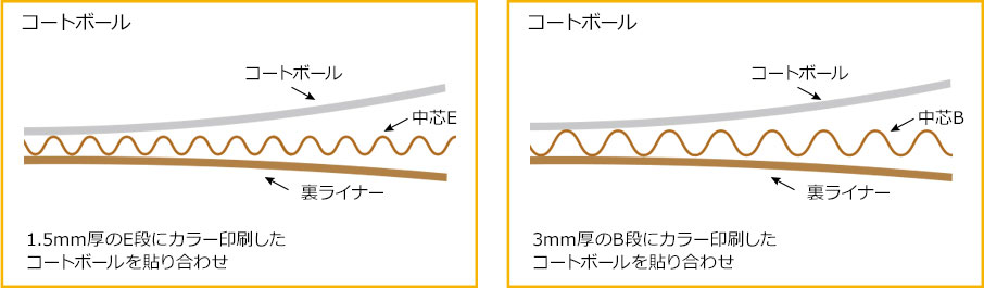 カラーボックス(化粧箱)の形式と入れる物の重さなどを配慮して印刷紙に段を貼り合わせる場合がございます。 重い商品を入れる場合や安全性を高めるために段と貼り合わせます。 ![]() |